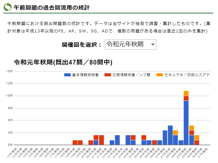 令和元年秋期の [午前試験] では、全80問中47問が既出の問題だった。50~60%が過去問の使い回しということになる。詳細はこちらの統計情報を見て欲しい。